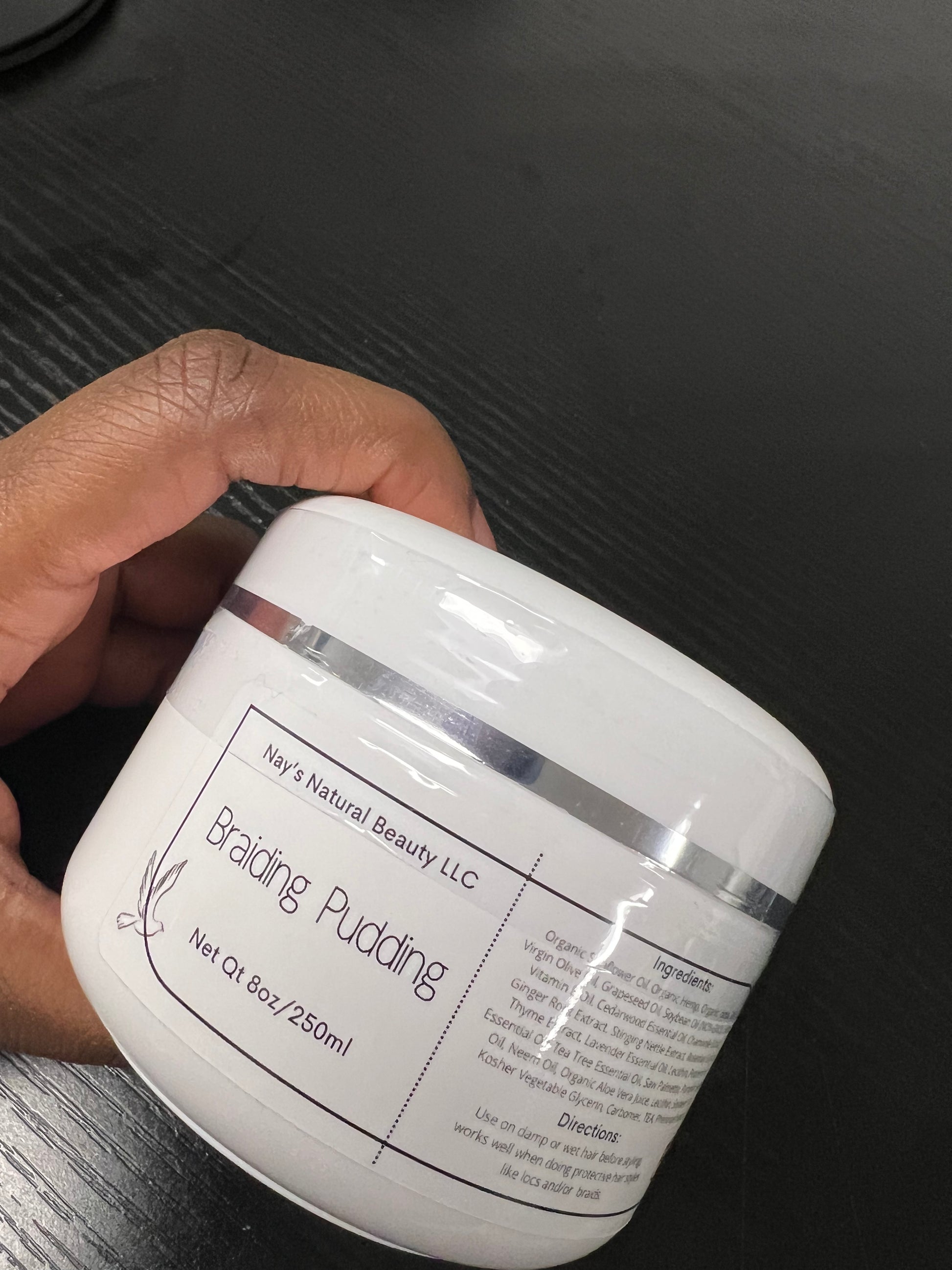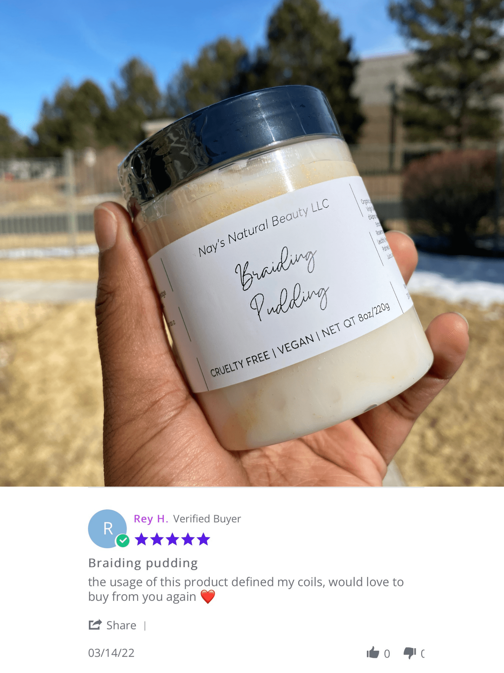 This braiding pudding is perfect for stylist or just someone who does their own hair at home who does not like the greasy clogging feeling of edge control all over their hair and parts. Use this pudding for styles like braids, twists, braid outs, locs, and more. Can also be used as a curling cream or just a plain old hair moisturizer it’s that great!